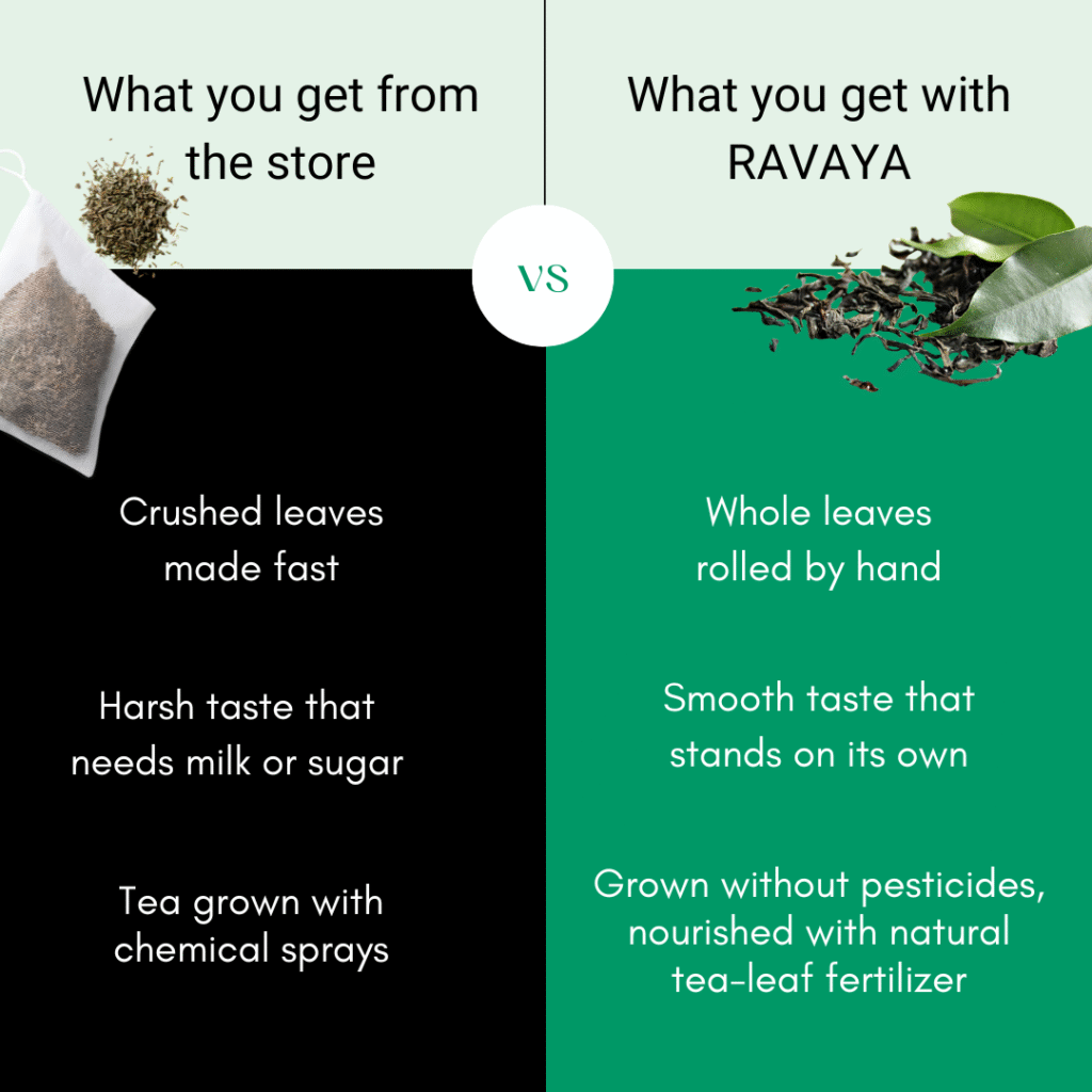 Taste tea made by humans, not machines. We make limited amounts and sell directly from a small farm in Ella.No middlemen. No blends. No dust. Shop our teas why ravayaMachines make fast tea. We make real tea. Most tea is machine-cut and mixed in bulk. It looks strong, but it’s mostly dust — flat in taste and harsh in the cup.We use only the first and second leaves — the youngest and most flavorful, usually reserved for export. Rolled gently by hand, they keep their natural oils and aroma. That’s what makes our tea clean, sweet, and smooth. THE PROCESSMade the slow way.Grown without pesticides, picked and rolled by hand on a small farm in Ella. 01Grown cleanNo pesticides. Just tea leaves used as natural fertilizer. 02Hand pickedWe pick only the youngest leaves by hand. 03Hand rolledEach leaf is shaped gently to bring out its natural flavor. 03Slow driedLow, steady heat keeps the tea smooth and fresh. OUR TEASSmall harvests from Ella.Limited quantities. Order through WhatsApp. Silver Tips10gOrder now Golden Tips20gOrder Now White Tea20gOrder Now Green Tea20gOrder Now Black Tea20gOrder Now VISITTaste in person.Are you in Ella? Come visit us. Join a hands‑on tea picking and tasting tour at our small farm — learn how tea is made by hand and taste each type yourself. Rs 6,000 per person. Book on whatsApp